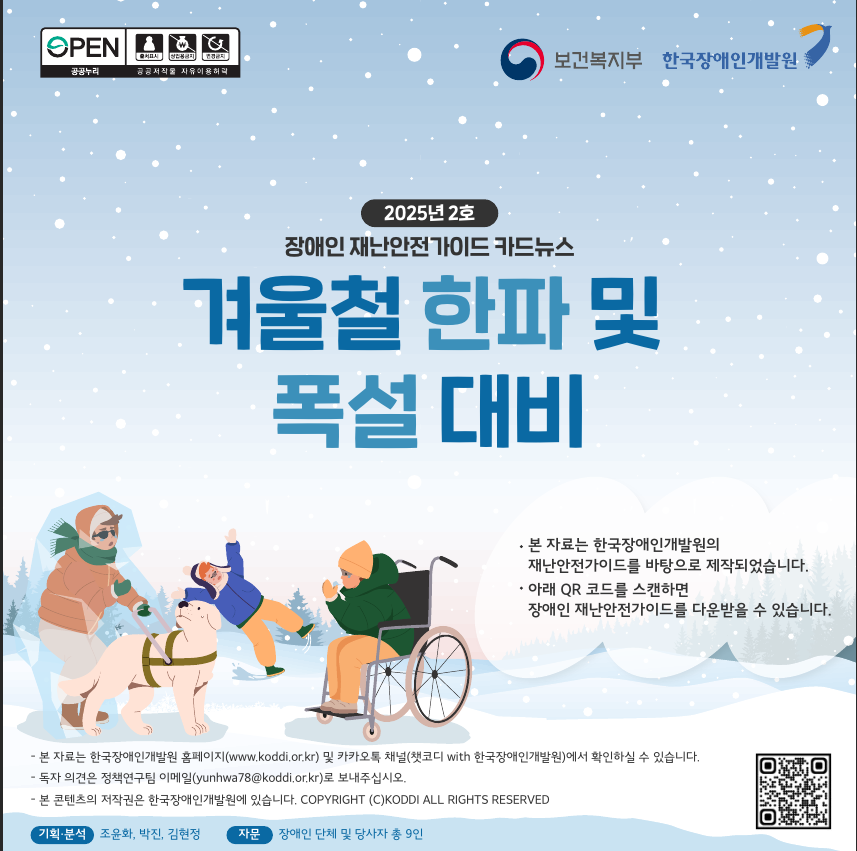 장애인 재난안전가이드 카드뉴스 2025년 02호(한파 폭설 대비) 페이지 정보 작성일 25-12-03 14:12 본문 장애인 재난안전가이드 카드뉴스 2025년 02호(한파 폭설 대비)첨부파일 있습니다. 첨부파일 123456-78.pdf (566.3K) 3회 다운로드 | DATE : 2025-12-03 14:37:06 목록 이전글2025년 연제장애인자립생활센터 하반기 소식지 26.01.20 다음글2025년 연제장애인자립생활센터 상반기 소식지 25.10.21