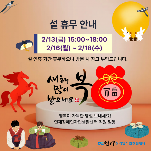 2026년 연제센터 설 휴무 안내 페이지 정보 작성일 26-02-11 16:13 본문 2026년 02월 16일 (월요일)~2026년 02월 18일 (목요일) 까지 센터 휴무임을 알려드립니다.새해 복 많이 받으세요~!! 목록 이전글[모집] 연제장애인자립생활센터에서 보치아 파워휠 자조모임 회원을 모집합니다! 26.02.12 다음글연제장애인자립생활센터 신규 채용결과(자립지원팀) 26.02.09