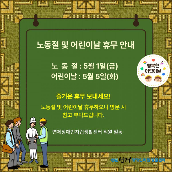 노동절 및 어린이날 휴무 안내 페이지 정보 작성일 26-04-30 15:49 본문 노동절 및 어린이날 휴무하오니 방문 시 참고 부탁드립니다.노동절 : 5월 1일(금)어린이날 : 5월 5일((화) 목록 이전글[2026년 5월] 프로그램 휴강안내 26.04.30 다음글[부산돌봄] 장애인 건강주치의 시범사업 안내 26.04.24