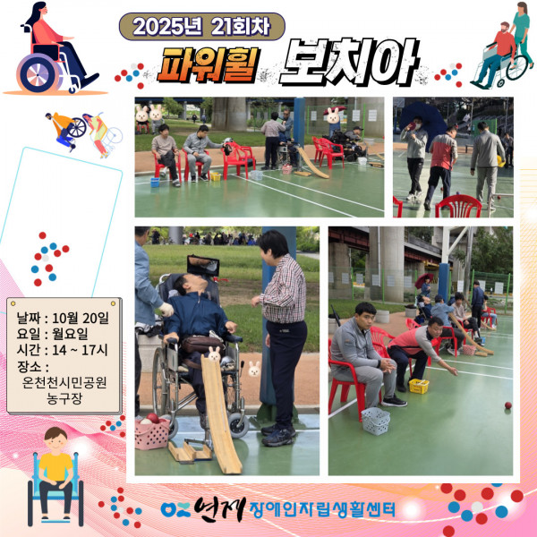 파워휠 보치아 정기모임 21회차 ♥ 페이지 정보 작성일 25-10-20 16:39 본문 파워휠 보치아 자조모임 21회차장소 : 온천천시민공원 농구장일시 : 10월 20일(월) 14:00 ~ 17:00 목록 이전글뉴스포츠 자조모임 13회차 ♥ 25.10.23 다음글지역사회 캠페인-4회차 ♥ 25.10.20