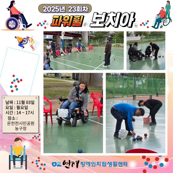 파워휠 보치아 정기모임 23회차 ♥ 페이지 정보 작성일 25-11-04 14:30 본문 파워휠 보치아 자조모임 23회차장소 : 온천천시민공원 농구장일시 : 11월 03일(월) 14:00 ~ 17:00 목록 이전글뉴스포츠 자조모임 14회차 ♥ 25.11.06 다음글지역사회 캠페인-6회차 ♥ 25.11.04