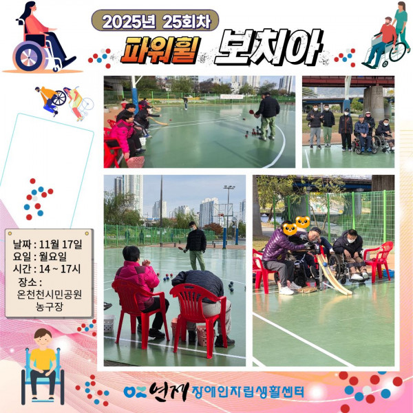 파워휠 보치아 정기모임 25회차 ♥ 페이지 정보 작성일 25-11-18 13:59 본문 파워휠 보치아 자조모임 25회차장소 : 온천천시민공원 농구장일시 : 11월 17일(월) 14:00 ~ 17:00 목록 이전글파워휠 보치아자조모임 리그전 26회차 ♥ 25.11.24 다음글지역사회 캠페인-8회차 ♥ 25.11.18